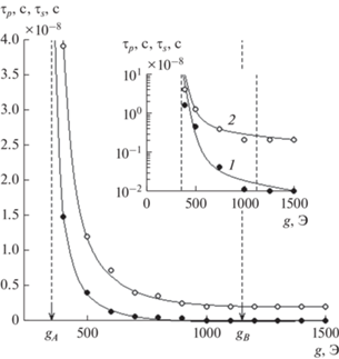 Зависимости времени развития амплитуды колебаний намагниченности до уровня 0.1 от максимума (кривая 1) и до уровня полного максимума (кривая 2) от величины параметра связи, где ${{g}_{A}}$ = 350 Э, ${{g}_{B}}$ = 1150 Э; на вставке – те же зависимости в логарифмическом масштабе.