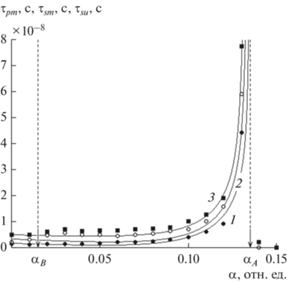 Зависимости времени развития амплитуды колебаний намагниченности до уровня 0.1 от максимума ${{\tau }_{{pm}}}$ (кривая 1) и до уровня полного максимума ${{\tau }_{{sm}}}$ (кривая 2), а также времени развития упругих колебаний до стационарного уровня ${{\tau }_{{su}}}$ (кривая 3) от величины параметра затухания намагниченности $\alpha $, где ${{\alpha }_{B}}$ = 0.015 отн. ед., ${{\alpha }_{A}}$= 0.135 отн. ед. (показаны вертикальными пунктирными линиями со стрелками на горизонтальной оси). Параметр связи $g$ = 1000 Э.