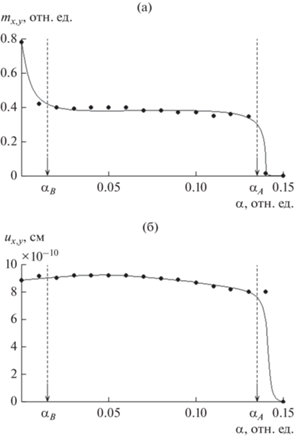 Зависимости установившейся амплитуды колебаний намагниченности (а) и упругого смещения (б) от величины параметра затухания намагниченности $\alpha $, где ${{\alpha }_{B}}$ = 0.015 отн. ед., ${{\alpha }_{A}}$ = 0.135 отн. ед. Параметр связи $g$ = 1000 Э.