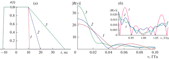 Трапецеидальные импульсы $r\left( t \right)$ с разной длительностью заднего фронта 1 (1), $3\pi $ (2) и $10\pi $ нс (3) (а) и графики модуля их спектров $\left| {R\left( \nu \right)} \right|$ в диапазоне частот от 0 до 100 МГц и в окрестности 1 ГГц (на вставке) (б).