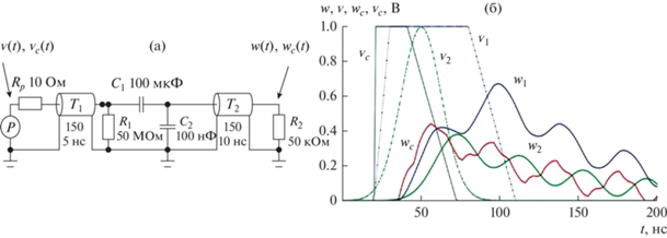 Рассмотрим численный эксперимент реконструкции одномерных сигналов ЛС-систем методом тестовых испытаний на примере емкостного делителя напряжения. Принципиальная электрическая схема делителя и сигналы на его входе ${{v}_{1}}\left( t \right)$, ${{v}_{2}}\left( t \right)$, ${{v}_{c}}\left( t \right)$ и выходе ${{w}_{1}}\left( t \right)$, ${{w}_{2}}\left( t \right)$, ${{w}_{c}}\left( t \right)$ представлены на рис. 2. Делитель состоит из емкостей ${{C}_{1}}$ = 100 мкФ, ${{C}_{2}}$ = 100 нФ, сопротивлений ${{R}_{1}}$ = = 50 МОм, ${{R}_{2}}$ = 50 кОм и предназначен для уменьшения амплитуды высоковольтных входных сигналов ($v\left( t \right)$, ${{v}_{c}}\left( t \right)$), поступающих от источника $P$ с внутренним сопротивлением ${{R}_{p}}$ = 10 Ом, до низковольтных сигналов ($w\left( t \right)$, ${{w}_{c}}\left( t \right)$) на выходе устройства. Сигналы передаются по помехозащищенным линиям передачи ${{T}_{1}}$ и ${{T}_{2}}$ (витая пара) с волновым сопротивлением 150 Ом и задержками распространения сигнала 5 и 10 нс соответственно. Делитель представляет собой ЛС-систему, так как является составной системой (см. разд. 1) из пассивных элементов, ${\text{и}}$ сигналы в нем могут быть реконструированы ТИ-методами.