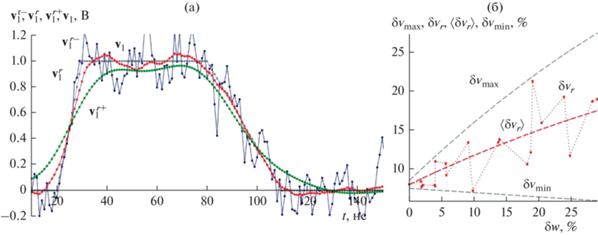 Результаты реконструкции ${\mathbf{v}}_{1}^{{r - }}$, ${\mathbf{v}}_{1}^{r}$ и ${\mathbf{v}}_{1}^{{r + }}$ трапецеидального воздействия ${{v}_{1}}$ при оптимальном ${{p}_{0}}$ (${\mathbf{v}}_{1}^{r}$) и неоптимальных $0.01{{p}_{0}}$ (${\mathbf{v}}_{1}^{{r - }}$) и $100{{p}_{0}}$ (${\mathbf{v}}_{1}^{{r + }}$) значениях параметра регуляризации (а) и графики погрешности $\delta {{v}_{r}} = {{\left\| {{{{\mathbf{v}}}_{r}} - {\mathbf{v}}} \right\|} \mathord{\left/ {\vphantom {{\left\| {{{{\mathbf{v}}}_{r}} - {\mathbf{v}}} \right\|} {\left\| {\mathbf{v}} \right\|}}} \right. \kern-0em} {\left\| {\mathbf{v}} \right\|}}$ реконструкции ${{{\mathbf{v}}}_{r}}$ воздействия ${\mathbf{v}}$ из отклика ${\mathbf{w}}$ при различных уровнях шумов $\delta w = {{\left\| {\Delta {\mathbf{w}}} \right\|} \mathord{\left/ {\vphantom {{\left\| {\Delta {\mathbf{w}}} \right\|} {\left\| {\mathbf{w}} \right\|}}} \right. \kern-0em} {\left\| {\mathbf{w}} \right\|}}$ в нем, наиболее ожидаемых значений $\langle \delta {{v}_{r}}\rangle $ и эмпирических пределов $\delta {{v}_{{{\text{min}}}}}$ и $\delta {{v}_{{{\text{max}}}}}$ погрешности реконструкции (б).
