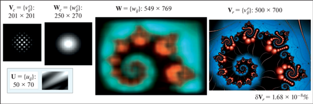 Восстановление ${{{\mathbf{V}}}_{r}}$ изображения ${\mathbf{V}}$ из изображения ${\mathbf{W}}$ при его размытии с ядром ${\mathbf{U}}$ спектральными ТИ-методами с использованием тестовых изображений ${{{\mathbf{V}}}_{c}}$ и ${{{\mathbf{W}}}_{c}}$.