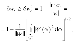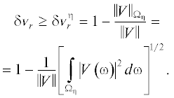 где спектр отклика $W\left( \omega \right)$ может быть выделен на фоне спектра $N\left( \omega \right)$ неопределенностей $\eta \left( x \right)$ уравнения (1). Здесь коэффициент $\gamma > 0$ характеризует методы выделения спектра. Используя равенство Планшереля, можно оценить ограничение $\delta v_{r}^{\eta }$ на точность $\delta {{v}_{r}}$ реконструкции воздействия $v\left( x \right)$ в диапазоне ${{{{\Omega }}}_{\eta }}$: