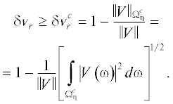 ${{V}_{r}}\left( \omega \right) = \frac{{W_{c}^{*}\left( \omega \right)W\left( \omega \right){{V}_{c}}\left( \omega \right)}}{{W_{c}^{*}\left( \omega \right){{W}_{c}}\left( \omega \right) + Q\left( {\omega ,q} \right)}}.~~$По аналогии с (5), используя равенство Планшереля, можно оценить ограничение $\delta v_{r}^{c}$ на уровень относительной погрешности $\delta {{v}_{r}}$ реконструкции воздействия $v\left( x \right)$ из ТИ-уравнения (2) в диапазоне реконструкции $\Omega _{\eta }^{c} = \left\{ {\omega :\gamma \left| {{{N}_{c}}\left( \omega \right)} \right| \leqslant \left| {W\left( \omega \right){{V}_{c}}\left( \omega \right)} \right|} \right\}$: