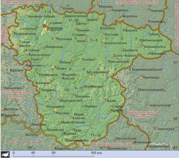 Отбор проб проводили вдоль дорог разной степени загруженности и в разных природных зонах: в лесной зоне – трасса М 4 в Рамонском р-не, в лесостепной зоне – трасса А144 в Аннинском р-не, в степной зоне – трасса М4 в Павловском р-не, проселочная автомобильная дорога в Богучарском р-не и железная дорога в Верхнехавском р-не Воронежской обл. (рис. 1, табл. 1). Заготовку проводили на удалении 0, 100, 200, 300 м от выбранных транспортных магистралей. Траву, листья и цветки заготавливали в июле, корни – в сентябре 2019 г.