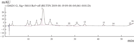 Изменчивость индивидуально-группового состава ФС двух подвидов L. caerulea (L. caerulea subsp. pallasii и L. caerulea subsp. altaica) в популяциях Горного Алтая была ранее изучена методами ВЭЖХ и ВЭЖХ-МС анализов [10, 13]. В результате данного исследования в экстрактах листьев особей из ценопопуляции L. caerulea subsp. altaica, произрастающих в окрестности п. Кайтанак было установлено 16 индивидуальных компонентов ФС, относящихся к фенолкарбоновым кислотам, флавонолам, флавонам и флавононам (табл. 1, рис. 1). Основными компонентами ФС экстрактов листьев у L. caerulea subsp. altaica был лютеолин-7-глюкозид (флавон), остальные определены в значительно меньших концентрациях, что соответствует ранее полученным результатам.