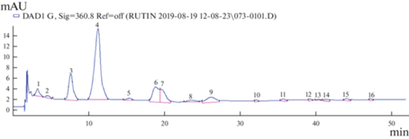 Анализ фенольных соединений, содержащихся в элюате, проводили на аналитической ВЭЖХ-системе, состоящей из жидкостного хроматографа “Agilent 1200” (США) с диодно-матричным детектором, автосамплером и системой для сбора и обработки хроматографических данных ChemStation, на основе модифицированой методики Т.А. vanBeek (2002). Использовали колонку Zorbax SB-C18, 4.6 × 150 мм, 5 мкм. Хроматографический анализ проводили сначала в изократическом режиме в системе метанол‒0.1%-ная ортофосфорная кислота (31 : 69) в течение 27 мин, далее в режиме градиентного элюирования: в подвижной фазе содержание метанола в водном растворе отрофосфорной кислоты (0.1%) изменялось от 33 до 46% за 11 мин, затем от 46 до 56% за следующие 12 мин и от 56 до 100% – за 4 мин. Скорость потока элюента 1 мл/мин. Температура колонки 26 °C. Объем вводимой пробы 10 мкл. Детектирование осуществляли при длинах волн λ = 254, 270, 290, 340, 360 и 370 нм.