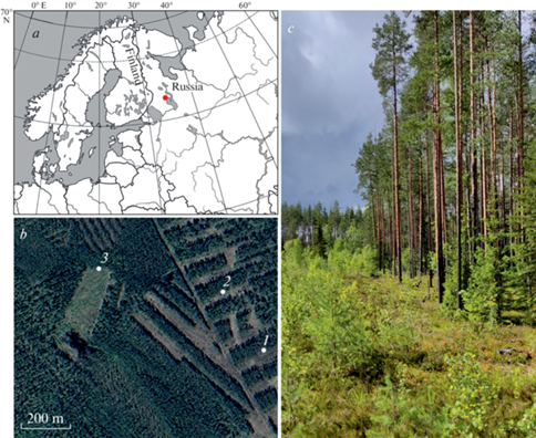 Исследования проводились в Кондопожском районе Республики Карелия (62°15′75″ с.ш., 34°61′36″ в.д.). Территория относится к подзоне средней тайги [7]. За последние 10 лет среднегодовая температура в районе исследования составила +4 °C, средние температуры самого теплого и самого холодного месяцев (июля и января) – соответственно +17 и –8 °C. Среднегодовое количество осадков варьировало в пределах 600–650 мм [8]. Наиболее распространенными типами леса в районе исследования являются сосняки черничные и брусничные на автоморфных почвах.