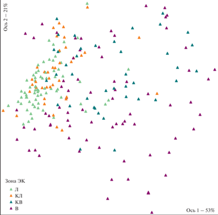 В целом, по результатам анализа параметров напочвенного покрова зона КЛ отличается от зоны Л более низкими значениями проективного покрытия и количества ягод черники, а также меньшей высотой побегов черники и брусники. Переходная зона со стороны вырубки (КВ) по сравнению с зонами Л и КЛ характеризуется бóльшим участием злаков и разнотравья. Ординация учетных площадок по значениям проективного покрытия видов травяно-кустарничкового и мохово-лишайникового ярусов (рис. 4) показала, что зоны Л и КЛ занимают примерно одинаковое положение в пространстве факторов и обладают наименьшим варьированием. Описания в зоне КВ отличаются от описаний в зонах Л и КЛ только вдоль первой оси и имеют заметно больший “разброс”. Зона В отличается значительным варьированием положения учетных площадок по обеим осям, что можно объяснить участием большего количества видов в сложении напочвенного покрова по сравнению с зонами Л и КЛ, что в свою очередь вызвано неоднородностью микроценотических условий из-за сочетания куртин хвойного и лиственного подроста, порубочных остатков, участков с оголенным минеральным горизонтом и др.