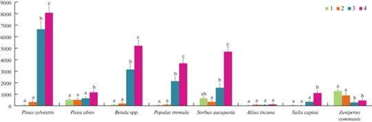 Подрост только шести древесных пород (сосна обыкновенная Pinus sylvestris L., ель европейская Picea abies (L.) H. Karst., береза Betula sp., осина Populus tremula L., ива козья Salix caprea L. и рябина Sorbus aucuparia L.) из восьми произраставших на пробных площадях, проявил положительную реакцию на рубку древостоя: в зоне КВ и/или В его среднее количество достоверно выше, чем в зонах Л и/или КЛ (рис. 5). Отрицательную реакцию на рубку показал только можжевельник Juniperus communis L., его количество достоверно ниже на вырубке по сравнению с лесом. Ольха серая Alnus incana (L.) Moench. на пробных площадях встречалась единично, оценить ее реакцию на рубку древостоя не удалось.