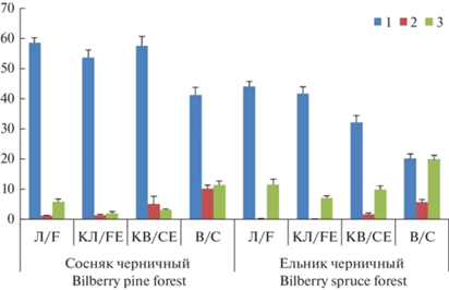 Проективное покрытие групп растений в составе травяно-кустарничкового яруса в экотонных комплексах разных типов леса. Показаны средние значения и стандартные ошибки средних. 1 – кустарнички, 2 – злаки, 3 – разнотравье. По веритикали – проективное покрытие, %. Fig. 6. Projective cover of the species groups composing herb-dwarf shrub layer in the ecotones of different forest types. Mean values and standard errors are given. 1 – dwarf shrubs, 2 – grasses, 3 – forbs. Y-axis – projective cover, %.