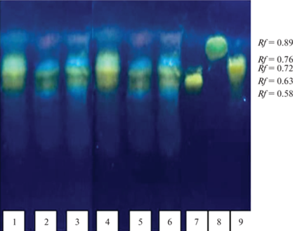 Хроматограмма спиртовых извлечений из цветков видов рода Syringa L.: 1 – S. sweginzowii, 2 – S. josikaea, 3 – S. emodi, 4 – S. komarowii, 5 – S. reticulate ssp. amurensis, 6 – S. vulgaris; 7 – рутин, 8 – лютеолин, 9 – лютеолин-7-глюкозид. Fig. 1. Chromatogram of aqueous-alcoholic extracts of flowers of Syringa L. species: 1 ‒ S. sweginzowii, 2 ‒ S. josikaea, 3 ‒ S. emodi, 4 ‒ S. komarowii, 5 ‒ S. reticulata ssp. amurensis, 6 ‒ S. vulgaris; 7 ‒ rutin, 8 ‒ luteolin, 9 ‒ luteolin-7-glucoside.