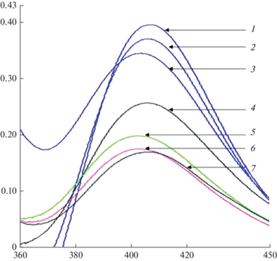 Спектры поглощения спиртовых растворов цветков видов рода Syringa L. и СО лютеолина-7-глюкозида с алюминия хлоридом(III): 1 ‒ СО лютеолин-7-глюкозид; 2 – S. komarowii, 3 – S. emodi, 4 – S. reticulate ssp. amurensis, 5 – S. sweginzowii, 6 – S. vulgaris, 7 – S. josikaea. По горизонтали – длина волны, нм; по вертикали – оптическая плотность. Fig. 2. Absorption spectra of aqueous-alcoholic solutions of flowers of Syringa L. species and reference standard of luteolin-7-glucoside with aluminum chloride(III): 1 ‒ RS luteolin-7-glucoside; 2 ‒ S. komarowii, 3 ‒ S. emodi, 4 ‒ S. reticulata ssp. amurensis, 5 ‒ S. sweginzowii, 6 ‒ S. vulgaris, 7 ‒ S. josikaea. X-axis – wavelength, nm; y-axis – optical density.