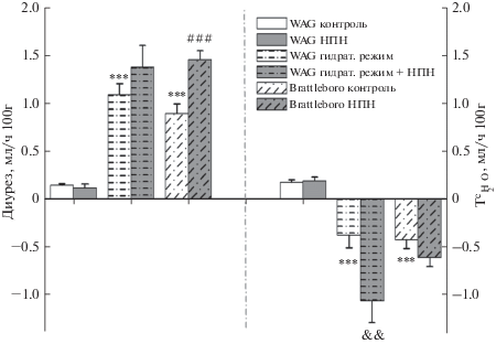 Влияние активации синтеза NO нитропруссидом натрия (НПН) на скорость мочеотделения и реабсорбцию осмотически свободной воды (${\text{T}}_{{{{{\text{H}}}_{{\text{2}}}}{\text{O}}}}^{{\text{c}}}$) у крыс WAG и крыс Brattleboro в различных экспериментальных условиях (M ± SEM). Достоверность различий: **P < 0.01; ***P < 0.001 – сравнение с контрольной группой WAG; ###p < 0.001 – сравнение с контрольной группой Brattleboro; P < 0.01 – сравнение с группой гидратированных WAG. Применялся апостериорный критерий Дункана (post-hoc Duncan’s test).