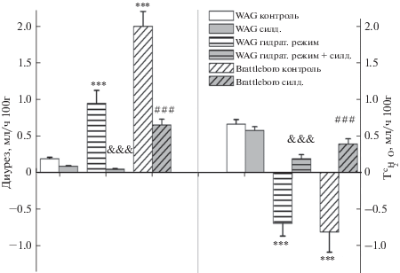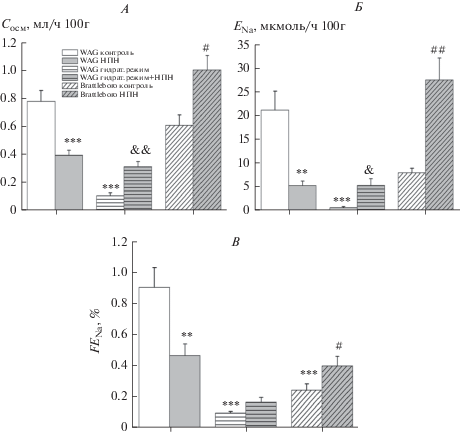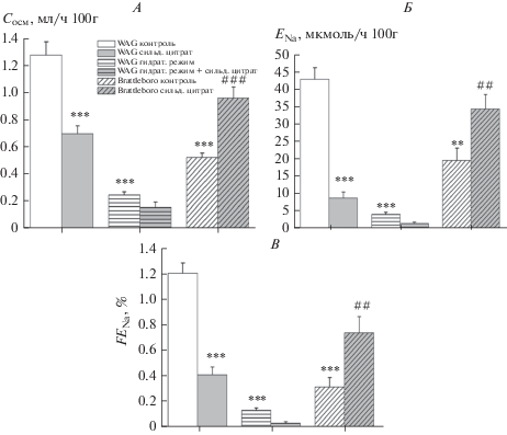 Примечание. V – скорость мочеотделения; ${\text{T}}_{{{{{\text{H}}}_{{\text{2}}}}{\text{O}}}}^{{\text{c}}}$ – реабсорбция осмотически свободной воды, ENa– скорость экскреции натрия; FENa– экскретируемая фракция натрия. Различия достоверны при **p < 0.01; ***p < 0.001 –сравнение с контрольной группой WAG. Применялся апостериорный критерий Дункана (post-hoc Duncan’s test).