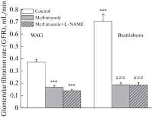 Скорость клубочковой фильтрации (СКФ) в условиях блокады синтеза NO введением L-NAME на фоне моделирования гипотиреоза у крыс линий WAG и Brattleboro (M ± SEM). Достоверность различий: ***p < 0.001 – сравнение с контрольной группой WAG; ###p < 0.001 – сравнение с контрольной группой Brattleboro.