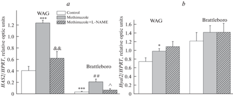 Подавление синтеза тиреоидной системы при потреблении раствора метимазола сопровождалось структурными перестройками интерстиция почечной медуллы только у крыс WAG с высоким уровнем эндогенного вазопрессина в крови. Согласно качественному гистохимическому анализу у гипотиреоидных крыс WAG, несмотря на отсутствие изменений параметров гидроуреза, установлено увеличение интенсивности окрашивания ГН в интерстиции сосочка по сравнению с контролем (рис. 2с). Качественные изменения экстрацеллюлярного матрикса почки у крыс WAG сопровождались увеличением содержания мРНК HAS2 гена, кодирующего фермент синтеза ГН (рис. 3a), в то время как уровень экспрессии гена Hyal2, ключевого фермента его катаболизма, увеличился незначительно (рис. 3b). Вместе с тем блокада синтеза NO с помощью L-NAME приводила к восстановлению внеклеточного матрикса до базального эутиреоидного состояния у гипотиреоидных крыс WAG (рис. 2e) в связи со снижением уровня экспрессии HAS2 в сосочке почки до базальных значений контрольной группы с нормальным уровнем секреции ТГ (рис. 3a). Моделирование гипотиреоза у крыс Brattleboro не вызывало существенных изменений состояния интерстиция почечной медуллы (рис. 2d), несмотря на снижение уровня экспрессии HAS2 в сосочке почки, устранявшееся при блокаде синтеза NO (рис. 3a). Вместе с тем при введении L-NAME крысам Brattleboro на фоне потребления метимазола не установлено качественных изменений интерстициального матрикса сосочка почки по сравнению с гипотиреоидной группой (рис. 2f).