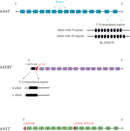 Общая структура и расположение наиболее известных однонуклеотидных полиморфизмов (SNPs) и переменного числа тандемных повторов в генах дофаминового (hDAT), серотонинового (hSERT) и норадреналинового (hNET) транспортеров.