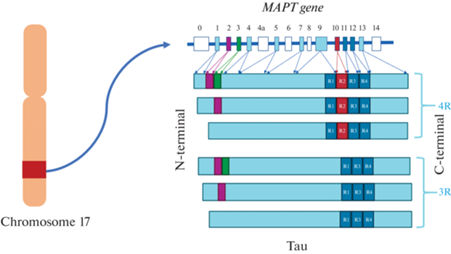Тау-белок кодируется геном МАРТ (microtubule-associated protein tau), и у человека представлен шестью изоформами, которые различается по содержанию экзонов (рис. 1). Активность тау-белка и связывание с микротрубочками регулируется фосфорилированием, а его гиперфосфорилирование приводит к агрегации белка и таупатиям [9]. У человека ген MAPT находится в 17-й хромосоме и кодирует три различных транскрипта. Первый содержит 2 тыс. пар нуклеотидов и кодирует ядерный тау-белок, который не связан со стабилизацией микротрубочек, а участвует в защите ДНК [14]. Второй транскрипт содержит 6 тыс. пар нуклеотидов и является основной формой тау-белка, локализующейся в ЦНС. Третий транскрипт содержит 8 тыс. пар нуклеотидов и обнаруживается в периферической нервной системе [15]. Ген тау-белка содержит 16 экзонов, 8 из которых подвергаются альтернативному сплайсингу [16]. Экзоны между собой отличаются вставками в N-концевом домене (изоформы N1 и N2), а также 3 или 4 повторами в домене, отвечающем за взаимодействие с микротрубочками (изоформы 3R и 4R) [15] (см. рис. 1).