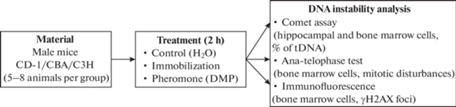 Цель данного исследования состояла в изучении влияния двух разных стрессоров (естественного плотностнозависимого хемосигнала домовой мыши – ДМП и искусственно создаваемого стрессора – иммобилизации) на целостность генома клеток гиппокампа и костного мозга, выявляемую различными цитогенетическими методами (щелочным кометным гель-электрофорезом, иммунохимическим анализом фокусов γH2AX и ана-телофазным анализом нарушений митоза) у самцов лабораторных мышей.