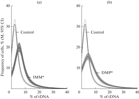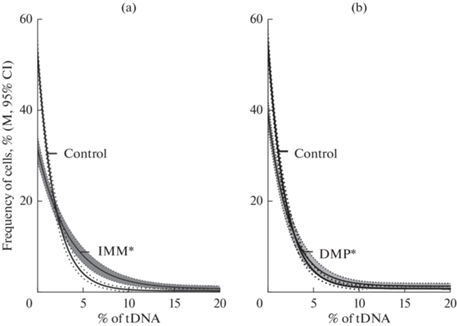 Визуальный анализ кривых демонстрирует, что частота неповрежденных клеток (с 0–2% ДНК в хвосте комет) меньше, а поврежденных клеток больше в группах, подвергнутых одному из типов стрессорного воздействия – иммобилизации (рис. 3a) или ДМП (рис. 3b).