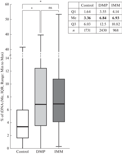 Степень повреждения ДНК в клетках костного мозга самцов мышей линии CBA после двухчасового воздействия ольфакторного хемосигнала (DMP) или иммобилизации (IMM). Приведены точные значения медиан и границ второго и третьего квартилей. n – число проанализированных ядер; * – различия достоверны (p < 0.0001, критерий Краскела–Уоллиса с апостериорным тестом Данна); ns – различия не достоверны (not significant, p > 0.05).