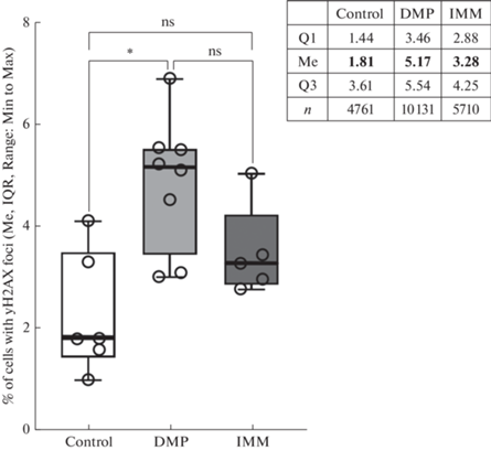 Частоты клеток костного мозга с фокусами γH2AX гистонов у самцов мышей линии CBA после двухчасового воздействия ДМП (DMP) или иммобилизации (IMM). Приведены индивидуальные значения частот γH2AX-позитивных клеток для каждого животного, а также медианы и границы второго и третьего квартилей для каждой экспериментальной группы. n – число проанализированных ядер; * – отличия достоверны (p < 0.01, ANOVA с апостериорным тестом Тьюки); ns – not significant (p > 0.05).