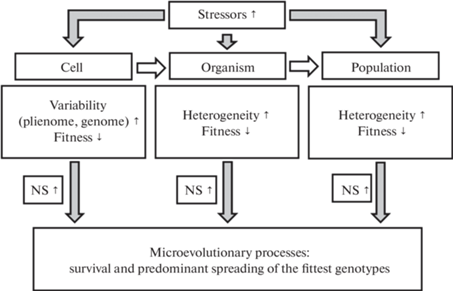 Сопоставляя результаты с полученными ранее данными [13], можно полагать, что стрессоры, действуя на различных уровнях (клеточном, организменном и даже популяционном), за счет нарушения работы и целостности генома клеток по крайней мере некоторых жизненно важных органов, приводят к возрастанию гетерогенности, но снижению выживаемости как отдельных организмов, так и целых групп. Это позволяет популяции адаптироваться к изменению условий окружающей среды за счет дифференциального выживания и размножения особей с наиболее приспособленными (в том числе возникшими de novo) генотипами (рис. 7).