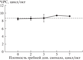 Нулевая плотность гребней – плоский (без гребенчатой структуры) спектр дополнительного сигнала. Горизонтальная пунктирная линия – контрольное (без дополнительного сигнала) значение ЧРС. Планки погрешностей – стандартные отклонения по всем измерениям.