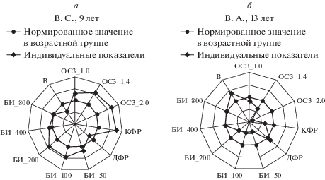 Анализ индивидуальных показателей сформированности разных механизмов у конкретного ребенка показал, что они могут различаться и быть независимыми от показателей остроты зрения. В качестве примера на рис. 13 приведены индивидуальные профили сформированности механизмов бинокулярного зрения в соответствии с выделенными показателями у двух школьников 9 и 13 лет.