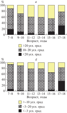 В возрастном интервале от 6 до 16 лет число детей с высокими конвергентными фузионными резервами (более 20°) по мере взросления неуклонно нарастало (0% – в 6 лет; 28% – в 9–10 лет; 40% – в 13–14 лет; 45% – в 15–16 лет, р < < 0.05), при этом количество детей с низкими конвергентными резервами (менее 10°) уменьшалось до 13–14 лет (34% – в 6 лет; 9% – в 9–10 лет; 2% – в 13–14 лет, р < 0.05). В возрастной группе 17–18 лет наблюдалось уменьшение числа обучающихся с высокими конвергентными резервами (до 22%, р < 0.05) и увеличение с низкими (до 30%, р < 0.05). Иная закономерность выявлена в динамике высоких и низких значений дивергентных фузионных резервов. Установлено, что число детей с низкими дивергентными резервами в возрастном интервале от 6 до 16 лет существенно не менялось (1–3%), в то же время с высокими с возрастом неуклонно увеличивалось до 15–16 лет (2% – в 6 лет; 11% – в 9–10 лет; 21% – в 13–14 лет; 35% – в 15–16 лет, р < 0.05).