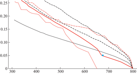 Штрихпунктирная красная линия на рисунке показывает положения выбранных из трех значений максимумов, а красная пунктирная линия – положения минимумов. Точки на кривой, показанной черной толстой пунктирной линией, были рассчитаны следующим образом. Для каждого из значений оси х (это число проекционных углов) выполнялась реконструкция всех трех сечений. Далее рассчитывалась метрика, согласно выражению (2), и полученные значения метрики усреднялись. В качестве “идеала” было использовано изображение соответствующего сечения, восстановленное по синограмме, включающей 801 угол. Тонкая штрихпунктирная черная линия на рисунке описывает расположение максимальных из трех рассчитанных значений метрик для каждого из значений оси абсцисс, а тонкая пунктирная – минимальных значений.