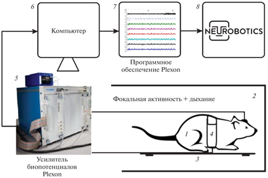 1 – наркотизированная крыса с вживленной в ОЛ микроэлектродной матрицей; 2 – экспериментальная камера (бокс); 3 – система для автоматического поддержания температуры тела животного; 4 – система контроля дыхания; 5 – 32-канальная система Plexon Multichannel Acquisition Processor (MAP) (Plexon Corp., Dallas, Texas, USA); 6 – компьютер; 7 – программное обеспечение Plexon, 8 – программное обеспечение Neurobotics.
