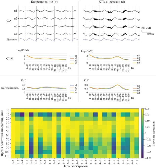 Нижняя часть рисунка – результаты корреляционного анализа спектральной мощности гамма-диапазона 90–140 Гц в динамике наркоза.