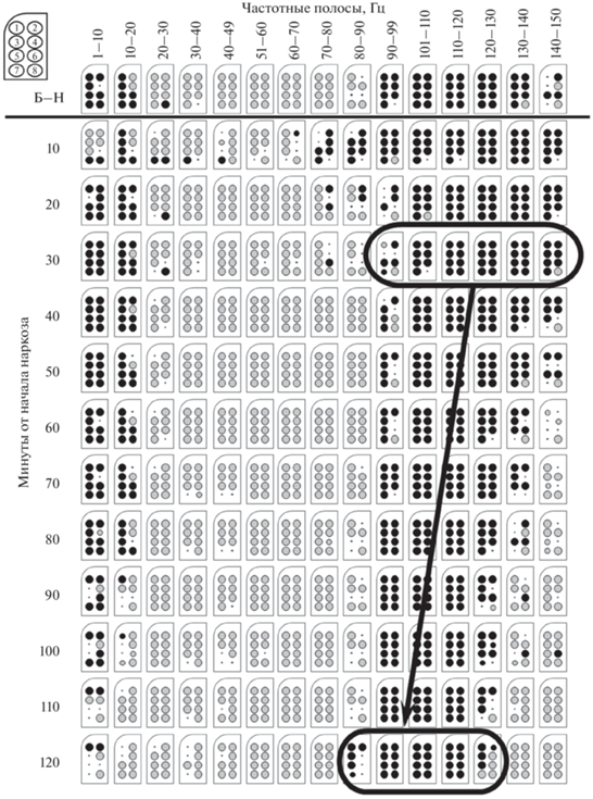 В последующем наблюдалось постепенное снижение мощности тета-частот, которая после 110-й минуты наркотизации практически не отличалась от бодрствования, при сохранении мощности высоких гамма-частот.