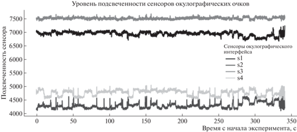 Не обработанные показания сенсоров, используемые окулографическим интерфейсом для генерации команд управления, где s1 – сенсор, расположенный под глазом, s2 – сенсор над глазом, s3 – сенсор справа от глаза, s4 – сенсор слева от глаза.