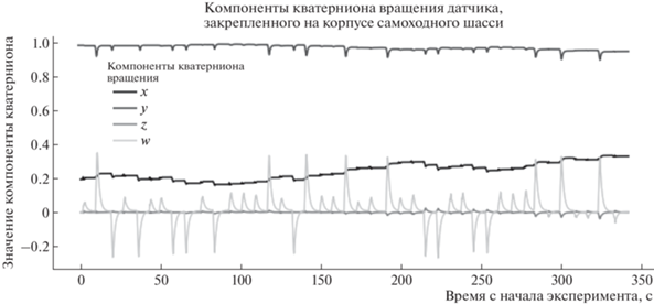 Компоненты кватерниона вращения, показывающие вращение датчика положения, прикрепленного к самоходному шасси, относительно положения в начале проведения эксперимента. Примечание: кватернион – это математическое обозначение вращения объекта в 3-мерном пространстве, представленное в виде 4-компонентного вектора с соответствующим обозначением компонент как [x, y, z, w].