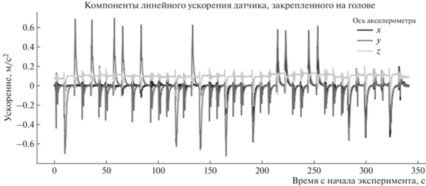 Гироскопы и акселерометры, с которых считывались данные, располагались на височной области испытуемого и на самоходном шасси, при этом оси, маркируемые как Х, соответствовали движению влево и вправо вокруг вертикальной оси, Y – вверх и вниз вокруг горизонтальной оси, Z – наклонам влево и вправо относительно сагиттальной оси, проходящей через датчик.