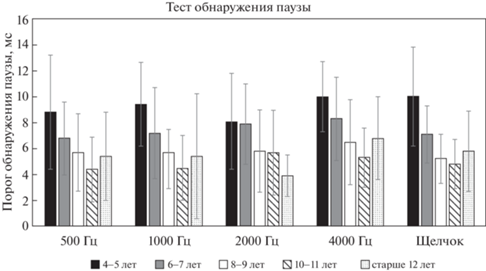 Результаты оценки временной разрешающей способности посредством теста обнаружения паузы для разных возрастных групп детей.
