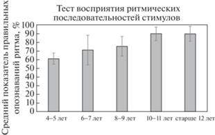 По оси ординат – средний показатель правильных опознаваний ритма в %, по оси абсцисс – возрастные группы.
