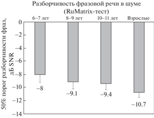 Тестирование в формате упрощенной версии RUMatrix продемонстрировало повышение помехоустойчивости речевого слуха по мере взросления (рис. 3).