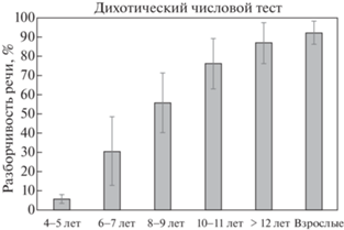 Результаты дихотического числового теста для разных возрастных групп детей (данные по взрослым испытуемым (Бобошко и др., 2016)).