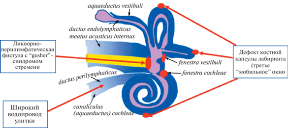 Вторая группа объединяет разнородные патологические состояния костного лабиринта внутреннего уха, приводящие к излишнему контакту перилимфатического пространства с окружающими анатомическими структурами – так называемое, третье “мобильное” окно лабиринта (рис. 2).