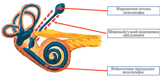 | Нарушение гомеостаза эндолимфатического пространства | Нарушение циркуляции эндолимфы | Синдром широкого водопровода преддверия |