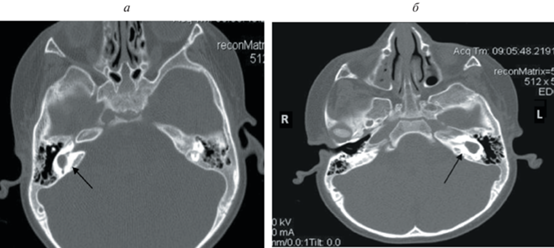 Компьютерная томография височных костей (рис. 1, а, б) выявила рудиментарно измененные улитки с обеих сторон, полукружные каналы дифференцировались неотчетливо и сливались с расширенным преддверием – внутренне ухо с обеих сторон было представлено единой полостью неправильной формы размерами справа 10.3 × 7.2 мм, слева – 12.6 × 6.9 мм.