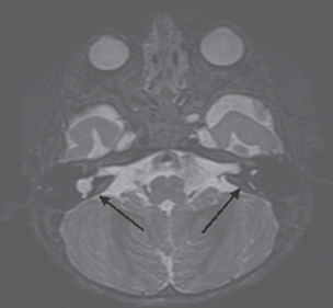 В связи с выявленными на КТ изменениями височных костей было принято решение о проведении дополнительного МРТ головного мозга и внутреннего уха (рис. 2).