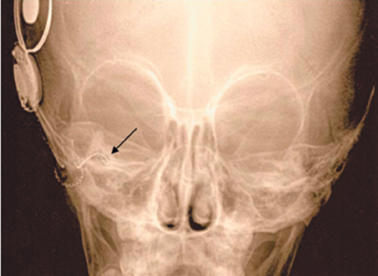 В результате удалось ввести 19 электродов из 22. Проведение интраоперационного тестирования имплантированного устройства – телеметрия нервного ответа (NRT) показала, что положительный ответ получен на 16 каналах электрода из 22. Послеоперационная трансорбитальная рентгенография улиток выявила, что активный электрод имплантата находится в общей полости (рис. 4). Таким образом, операция кохлеарной имплантации была успешно выполнена.