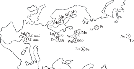 Материалом для статьи послужили опубликованные данные о распределении бурозубок гомозиготных и гетерозиготных по гаплоидным наборам хромосом с различными Rb-транслокациям в 12 гибридных зонах обыкновенной бурозубки, в том числе трех ранее описанных с участием авторов этой статьи (рис. 1).