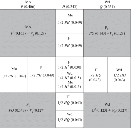 Поскольку у бурозубок происходит ежегодная смена поколений, то наблюдаемые в данном поколении неравновесные частоты генотипов (P0, H0, Q0) должны повториться на следующий год в следующем поколении (P1, H1, Q1). В качестве примера рассмотрим возможное влияние ассортативного скрещивания на частоты генотипов в гибридной зоне хромосомных рас Западная Двина/Москва (таблица, зона 8). Мы выбрали эту исследованную нами ранее гибридную зону (Орлов и др., 2012), чтобы показать, что для такого анализа пригодны даже небольшие выборки (менее 50 особей), но собранные на малых участках гибридной популяции, около 0.25 км2, в наибольшей степени приближенной к панмиксным. Ожидаемые при случайном скрещивании доли генотипов можно наглядно показать на решетке Пеннета (рис. 2). При случайных скрещиваниях в этой гибридной популяции частоты генотипов значительно изменятся в следующем поколении и останутся такими в последующих поколениях (закон Харди–Вайнберга). В данной гибридной зоне неравновесные частоты генотипов будут сохраняться из поколения в поколение только в том случае, если 84.9% случайных скрещиваний или оплодотворений Мо × Wd будут замещены неслучайными Мо × Мо и Wd × Wd (R = 0.849). Тогда частоты каждой гомозиготы увеличатся на вариансу частоты аллеля Vq = 0.127 (Р1 = РE + Vq и Q1 = QE + + Vq), а частоты гетерозигот уменьшатся на 2Vq (H1 = = HE – 2Vq) до значений близких к Р0 и H0 в исходном поколении родителей.